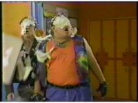 Skull & Bulk get splattered with cake flying on top of them while in Juice Bar entryway. |