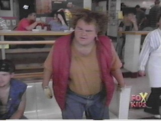 One of the other Bullies (the "Bulk" one, aka #3), is a bit disturbed, and i'm not talking just about his freaky hairstyle! He calls out, "Hey, man!", as he stands up, slipping on the chili debris and causing him to fall to the ground harshly. Kim continues whining about her nail, "Ughhhh!" The first Bully wipes off his chili-covered face and leather jacket, and calls out to his posse, who are all sitting at the booth parallel to our five new teenage friends. What a bunch of badass punks worth their salt would be doing hanging around a bowling alley, I dunno. Anyway, one guy says, "Yo, Spazzo!", and another claims, "C'mon, let's mess 'em up!" The group of bullies oblige, including #3, who recovers from his slip rather angrily. The Chili-covered First Bully walks over to Kim, who is still mourning the loss of her nail. He tells her, "Hey, you're gonna pay for this," showing her his messy outfit, "BIG time!" Witnessing this confrontation, Billy stands up and nervously asks, "Excuse me, may I interrupt?" Bully #3 comes up behind him, grabs his shoulder, belches, and yells, "Sit down, Dork!", physically forcing the geek back to his seat. Bully #1 clenches his fingers around Kim's chin, telling her, "Yeah, well, you can make it up to me tonight. At the movies..." She won't have any of that, slapping his hand away and telling him, "Sorry, but I don't date non-humans." He won't take no, attempting to force a chili-covered kiss on her, before she shoves him off with a loud squeal of, "Ahh! Get out of my face, you...!" Bully #2, wearing blue flannel and a headband, walks up close to Zach and asks, "What are YOU lookin' at?!", prompting Zach to push him with a yell of "Yo, back off!" Trini takes on #1, slapping her hands against his chest and sticking up for Kim by telling him, "Hey! Leave her alone!" He has, as the blonde Female Bully (who, IIRC, appeared on some early MMPR episodes as well) then starts to get up on Kimberly, pushing Kim around personally. Kim cries, "Cut it out!" #2 shoves Zach, inspiring Jason to intimidate the bully with a shout of, "Watch it!" Zach cuts his pal off, telling him, "I got this." #1, a face-friendly Bully, places his hands around Trini's head, rubbing her skin and asking, "You gonna MAKE me, little girl?" Trini replies with a confident, "uh-huh!", and a swift, loud kiyaahing chop to his arm, then another, a face swipe, followed by a full body toss. Bully #2 and #3 have teamed up in front of the lanes, as Jason now tells his partner, "Take 'em out, Zach!" Zach remarks to Jase, "Yeah, man. Check this!" He begins jiving some Hip Hop moves, shaking his groove thang (not to be confused with Thuy) to an imaginary beat. #3 asks, "So, you gonna DANCE, or ya gonna FIGHT, sissy?!" His answer comes when Zach drops to the ground and sends his feet flying upwards into #2 & #3's faces, shouting, "I'm gonna FIGHT!" Nearby, Kimberly is still tangled with the Female Bully, they're locked in Mortal Cat Fight, with Kim remarking, "Let go of me, Bleach Head!" #1 throws a punch at Trini, but she ducks and tosses a kick into him, sending his body into the Ball Return, knocking him over once more. Billy, sitting safely at the scoreboard, makes funny faces at the sight of each painful blow, as the crowd of onlookers gathered behind him let out "Oohs" and "ahhs" and "that's gotta hurt" type sound effects.