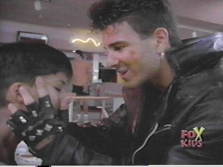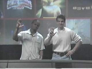 The clips end and we're back in the studio, with WEJ & ASJ hanging out near the PRT Cat Zord. WEJ notes, "As soon as Power Rangers took off, it began to change. I mean, there were always new villains, new Zords, and even new Rangers." ASJ anxiously chimes in, "Oh, and great new episodes! Like the one where I became the Gold Ranger." WEJ won't be upstaged and brings up, "OR, my birthday episode. Yeah!" ASJ rebuffs by mentioning, "Well, what about the one where I got to fight Goldar... ALONE!" WEJ asks, "Oh yeah? Well, what about my spider episodes!? I mean, that was cool!" ASJ concurs, talking over him, "Well that was good! But..." This segues the two into getting lost in arguing loudly. They finally calm down, both smiling, while remembering they're still on camera. WEJ states, "Uhh, well, it wasn't as good as your movie performance." ASJ returns the compliment, "But you know what? I loved you Hip-hop Kido episodes!" WEJ agrees, "Yeah! That was cool!" ASJ does a few mock moves, adding, "Thingamajig!" WEJ ends their whizzing contest, "Alright, check it out. Why don't we just... move on to the next segment?" ASJ concurs, "Move on!"