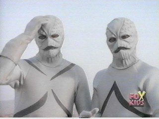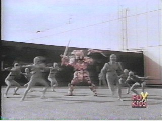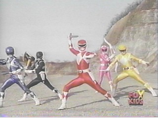 Inspired by Jason's determination, the teens do as he says. Using a four-grid screen (showing the Zyuranger actors in each one, aiming their buckles at the camera, with the coins within glowing continuously the individual Ranger power color), they call upon their powers. Top left: Kimberly holds her Transmorpher up in her right hand, shouting, "Pterodactyl!" as her buckle pops open, with the coin inside. Bottom right: Trini does the same with her Transmorpher, shouting, "Sabertoothed Tiger!" Top right: Zach also aims his Transmorpher, summoning, "Mastodon!" Bottom left, Billy holds his Transmorpher up, and steadily says, "Triceratops." The four grid is replaced by a single shot (of ZyuRed holding his buckle out), with Jason appearing inside it, stating, "Tyrannosaurus!" A blurry image passes by, showing Jason with a Red Ranger helmet on, but his normal clothes on the rest of his body. The image quickly fades, into the fully morphed mighty team, proclaiming their names as, "Power Rangers!!!" The Pink, Yellow, Red, Black, and Blue Rangers stand together in the desert, holding their special weapons in hand. Notice, the Sentai footage on the pilot is very grainy, even more so than any other episode. Anyway, the two Putties from earlier watch this, and grunt confusedly at one another. One of them even scratches his head, confused as to why they keep showing these guys up close when you can see the human eyes within their crappily designed suits (this clip, a tad few around it, were reused in "Foul Play In The Sky" for Kim's flashback!). The five Rangers scramble, and suddenly regroup, to hold their weapons and proclaim again, "POWER RANGERS!" At the Command Center, Alpha 5 excitedly presses some buttons, exclaiming, "Zoltar, they've DONE it! They've MADE the metamorphosis!" The giant green head replies, "Good! Teleport them to downtown Angel Grove City. Rita just sent down Flyguy!" Alpha holds his hands in the air, as always, and obeys, "Right away, Zoltar!" In the desert, the five Power Rangers leap into the air, completely leaving us out of whatever happened with the Putties. The traditional, "Go Go Power Rangers" theme-song plays, mostly instrumental. The teens revert to streaks of light, as seen earlier. Billy notes, "We're teleporting again!" The five Rangers suddenly land atop a building, and though Red Ranger holds his hand outward, he remains silent. Goldar (or whatever he's called in the Pilot Universe. He and the other Evil Space Aliens could all be named Frankenbeans for all we know) leaps off an upper level, and lands on the roof the Rangers are standing on. He's quite silent as well, causing a group of much more active Putty Patrollers to appear around him. Red, Black, Blue, and Pink Rangers take on these Putties, which swarm around them rapidly. Kicks, punches, and even flips are thrown, and somehow, the energy from their new Morphed bodies makes the teens much better fighters against the claybrain drones. Yellow Ranger actually has something to say, as she hops on a Putty, takes him down, then leaps atop an upper level. She pulls out her red Saber weapon in her holster, switches it around to Blaster mode, and aims it down at the Putties below. Trini demands violently, "Alright, Dweebs! DANCE!", as she fires bolts of laserpower at the feet of the three Putty Patrollers.