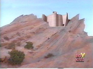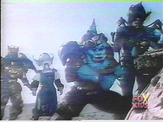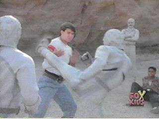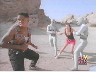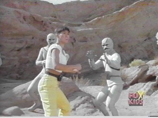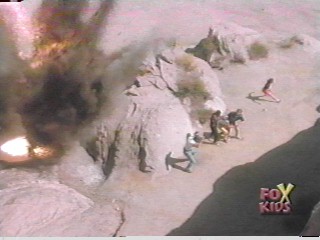 The five teens exit out of the dark console room, and find themselves in the sunny exterior of the massive Command Center complex. They wander around, and soon spot a patch of dirt, leading out in the mountainous deserts surrounding the building. They talk over one another loudly, with Jason being most focus, arguing, "I mean, think about it. I'm saying we can do this. C'mon, don't you guys think we can!? We can DO this! What's the problem here? Come on, listen to me! I think we can does this!" Kimberly throws her arms up, and says something the effect of, "What-EVER!" The others also ignore Jason's pleads, replying negatively as they head into the desert. Kim complains, "Great, we're out in the middle of NOwhere!" Billy concurs, "Yeah!" Jason uses this wandering nomadic excuse to note, "We shouldn't have left. I mean, he chose US to save the world! I say we do it!" Trini squintly asks, "Do you REALLY think we could?!" He confirms, "Yeah!" Zach follows behind, staggering along the dusty hillside, asking, "Are you two CRAZY?! Do you hear what you're sayin'?!" Meanwhile, up on the moon (err, I think. We just saw her palace on Earth, so how did it get back to the moon so quickly?!), Rita Repulsa peers through a telescope of her own design, and watches the five teens walking through the desert. She gasps, "What?! It CAN'T be!" Rita turns away from the scope and groans to Goldar, "Teenagers?! Zoltar must be behind this." She glances over to a cuckoo clock with a skull on it, and becomes much happier, remarking, "Hahaha! Gamma rays, and burning gold, let them fight my Putty Patrol!" Squatt rubs his belly, gulps loudly, and wipes his fanged mouth for some reason. Rita heads over to a strange Roman architectured area of the room, with a burning flame nearby. She aims her magic wand into the air, and demands, "Take THAT!" She fires a bolt of pink energy, which blasts into the rocky area behind the five teens! This shot, of the explosion ripping out and shaking the ground in the desert, was actually reused in MMPR (despite how the teens clothes here differ from MMPR)! The teens wobble and cry, "Whoah!" Kim crouches down and screams, "Ahhh!" Suddenly, from the charred blast crate, several grey-skinned creatures pop out and swarm upon the teens. They're the Putty Patrollers, and though they look like they do in MMPR, their outfits a bit cruder (including how you can see the human actors' eyes around the edges of the large eyeholes). Trini shouts disturbed, "Great!" Jason quickly takes command, telling his pal, "Everybody stay together! Zach, those two." Zach dances across the dirt, replying, "Right, these two are MINE!" He faces the pair of Putties, busting a move for them, before swiftly jumping up and attempting to kick one in the chest. The kick slams into what sounds like metal, causing Zach to groan to his pals, "Uh-oh." Trini notes, "This is GONNA hurt!"