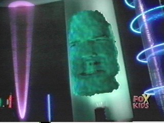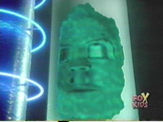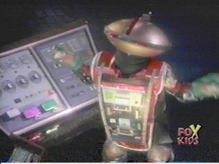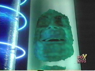 The beam hits Africa, but in actuality, it swings around and strikes Angel Grove. This blast of energy causes a tall skyscraper to begin driving itself down the street, until it reaches a dead-end, and takes off like a rocket into space! The magical disturbance shakes the entire town like an Earthquake, the bowling alley hit especially hard. How the TV was showing scenes of the moving building when it happened so suddenly is a mystery (Pilot Universe has magical psychic reporters!). Anyway, the building quakes, the pins topple, the people cry and flee in a panic. Our five young bully fighters have rounded the group of four beaten punks into a small heap. What they were planning to do to them there was unclear, but I get the feel much ball breaking was in store. The five courageous teenagers with attitudes start to wobble and fall over as the waxed laned Earth moves violently beneath their feet. Zach & Jason help Kimberly up as she remarks, "Great, just what we needed, an Earthquake!" Billy helps Trini up and notes ominously, "No. That was no Earthquake", despite how the Earthquake continues to occur! Meanwhile, on the outskirts of the city, we find the Command Center (with the same "mountain exterior" shot as would be used for years), also being rocked. Inside, in the central console room (which is designed with far more blue, green and pink neon lights than in MMPR, plus taller pillars, and lots of static-y small TV monitors in the consoles). It's much better lit, showing the scope of the futuristic styled room as being quite large), Alpha 5 exclaims in fear, "Oh, my! Oh, my! What is all the shaking? It's the BIG one! I know it! I know it! We'll shake apart!" Alpha is, well... Alpha's quite a mess in terms of design here. He's got the similar gold domed head with blinking red-lights in his visor-line eye, but has a fin running down the top of his head. His body looks like it's made of tons of padding, with a few grids of lights and wires strew in various areas. It's quite crude, but if you squint real tightly, he pretty much looks the same. The massive GREEN tube located directly against the wall facing the circle of electric consoles suddenly has a giant head inside of it. The head looks warpy and wavy, like it's strained through water or some such. The head inside, is of a creature named Zoltar, his facial transmission appearing quite clearer than Zordon's ever did on MMPR, as he can truly see his mouth and lips moving in time with his speech! Zoltar pops on the tube, and just after the Earthquaking ceases, he stresses in a deep, booming voice, "Calm down, Alpha! It's Rita. She's escaped and she's attacking the planet." Alpha nervously hits a few buttons, and asks, "How can you be so sure, Zoltar?!" The big green head replies, "My sensor array picked up her evil vibration!" Alpha whines, "We'll be destroyed! I KNOW it!" Zoltar tells the robot, "Initiate Plan B, immediately!" Alpha sighs, "Ahh, what IS Plan B?" Zoltar frustratedly references Doctor Forrester, by demanding, "Just PUSH the button, Alpha!" Alpha still wonders, "But what will THAT do?!" Zoltar explains (with Alpha anxiously adding 'yes, yes!' repeatedly throughout), "Teleport to us the most DANGEROUS group of ruthless, underhanded, overbearing, self-absorbed and overemotional humans in the area." Alpha clutches his domed head in shock, exclaiming, "NO! Not... TEENAGERS!" Zoltar confirms, "Cor-rect!" Alpha focuses on the console, and obeys, complaining seemingly playfully, "I was AFRAID of that..."