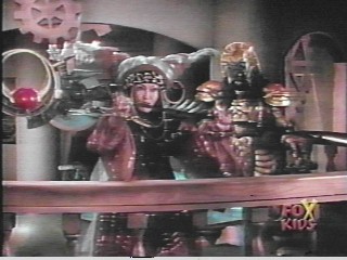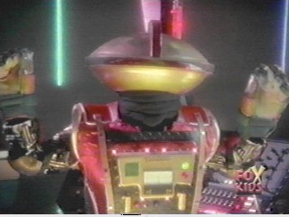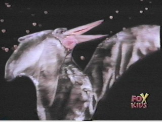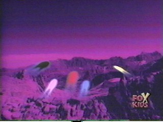 On the moon (?!) palace, Rita Repulsa readies her magic wand, angrily snarling, "Ooh! I'll show you teenagers. You'll see how it goes when Flyguy GROOOOOWS!" Goldar is standing behind her in this shot, without his wings. Did he get them clipped off in battle and returned home to cry to mommy? Anyway, Rita pitches her wand off the side of the balcony, sending it flying through space, slamming into the desert ground. It sends a surge of power into the dirt, causing the ground to rip open and for fire to spew forth. A brand new monster suddenly appears (King Sphinx in MMPR), apparently the Flyguy she referred to. The energy from her wand causes the creature to become a giant, grunting and growling through the mist. Red Ranger is standing near a very brightly reflecting pool of water in the desert, holding a red popsicle into the air. Jason commands, "I call on the power of the Tyrannosaurus!" The ground rips open again, and through the molten hot Earth, springs a robotic T-Rex! In our universe, it's the Tyrannosaurus Dinozord. Here in the Pilot Universe, it's known as the Tyranno-Droid! It growls quietly, and soon appears on the scene, allowing Red Ranger to hop atop its head. He yells, "Alright, let's GO, guys!", before slipping through a door in the T-Rex's head, and falling into the cockpit. It's a roomy single-occupant cockpit, with a red T-Rex symbol behind it. Jason admires, "Whoah! Cool!", as he does some control clutching. After a flash of light, the other four Power Rangers race through the yard, with Pink Ranger crying, "Hey, wait for us!" Each one leaps into the air, and lands in an unseen Dynodroid. Red Ranger shouts, "POWER Rangers! Count off!" Black Ranger falls into a Masto-Droid cockpit, claiming, "Zach, here! This is KICKIN'!" Blue Ranger slides into a Tricera-Droid cockpit, and replies, "This is Billy. I'm nominal!" Yellow Ranger hops into a Sabre-Droid, exclaiming, "Trini, here. This is GREAT!" Pink Ranger lands into her Ptera-Droid cockpit, and remarks impressedly, "Hey, nice STERE-O!" Red Ranger tells them, as he clutches his red popsicle, "Use your crystals to activate the dyno-power, NOW!" He inserts his pops..err, crystal into a slot, as do the others with their own colored crystals, all shouting in unison, "Rock and ROLL!" Jason shifts the gear, and asks, "Is this a great ride... or WHAT?!" The five Dyno-Droids are shown racing along, and preparing to come together. It should be noted, that in the Pilot Episode special, all vocal remarks to the Zords being called Droids are erased. They actually loop in Thuy Trang's voice of saying, "Trini here! Ready to ROCK!" Cutting into Pilot Trini saying in a different tone, "Comin' AT ya!" This was to hide a line (which, btw, is oddly Closed Captioned!) where Pilot Trini states, "Trini in the Sabre-Droid. Comin' AT ya!" Again with the looping, as Pilot Billy says, "Billy in the Tricera-Droid. All systems GO!", but is replaced by, "This is Billy. All systems GO!" One more time, with Pilot Zach claiming, "Yo, this is Zach! Me and my Masto-Droid are right on target!", while normal Zack says, "Zack here! This is KICKIN'!"