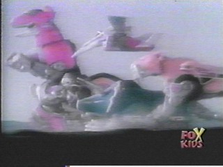 The five Droids come together, into the Megazor... err, MegaDynoDroid in, uhh, tank mode. The Rangers sit together in the combined cockpit, all grunting as they're suddenly deposited into it. Red Ranger urges, "Let's nail some BAD guys!" The team responds in unison, "Morphin'!" Blue Ranger notes, "This leaves me quite ebullient!" Pink Ranger figures, "I guess that means he LIKES it!" Their attention turns to Flyguy, who stands aside as a now-giant Goldar joins the fight. He charges up his sword, and fires it at the approaching Megadroid. Black Ranger remarks, "Uh-oh! It looks like ugly man brought a friend!" The cockpit is rocked for a moment, until Zach orders, "Hit 'em with the Dyno-power!" The Megadroid unleashes a burst of energy, which hits both Goldar & Flyguy. Yellow Ranger wonders, "What do we do now?!" Red Ranger states, "Activating the MegaDynoDroid!" (though the MMPR Jason voice is cut in to say instead "Activating Megazord BATTLE Mode!") A computer voice announces, "MegaDynoDroid transformation has been initiated!" (but instead, the MMPR voice cuts in, and says "Megazord Mode has been initiated") The structure shifts around, into humanoid stance, and once the Ptera-Droid flies in to lock on the chest and head pops out, the computer voice claims, "MegaDynoDroid activated!" (the line's cut, but nothing is filled in. Also notice numerous sound effects changes from the normal version, despite how the music remains the same) Flyguy charges forth, only to get a jolt from a surge of energy fired from MegaDynoDroid's horns! While he and the ever-silent Goldar recover from the blast, the Megadroid pulls out a large sword, which sparkles magnificently. Flyguy gasps, "Uh-oh", which seems to be the secret word for today. Rita, watching this through her scope, also gasps, "Uh-oh", officially making the Pilot Universe's nickname as "The Uh-Oh Cosmos". The five Power Rangers, in the cockpit, chop into the air with their right hands, shouting, "Hiyaah!" Megadroid raises its Sword, charging it up as its eyes flash and a crimson squall of clouds converge behind it. Just before lightning strikes the sword, Jason asks, "Hey, ugly. How 'bout some Mega DYNO power?!" Flyguy growls, and trembles, as the sword is lowered, and a slash of energy tears through him. He cries, "Owwww, that HURT! Awwww...", as his body falls limply to the ground, and explodes massively. Goldar appears to have snuck away yet again, the slippery mute. Our heroes cheer, "Wooo!", "Yeah!", "We did it!", "Alright!" On the moon, Rita Repulsa lifts her leg up onto something, and screams, "Oh no. UGHHHH! I've got such a... a headacheeeeee!" Baboo & Squatt grovel in fear at the sight of her nearly lifted up skirt. The MegaDynoDroid stands triumphantly on the battlefield, as we hear "Yeah, alright!", and "We got 'em! Hahaha!", among other cheers from within.