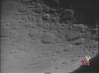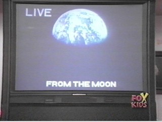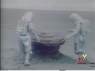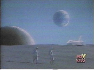Zach flips away from the laid-up Bully #2 & 3, before slapping Jason's hand and tagging him, claiming, "My turn!" Jason waits for #2 to stand, and he fakes him out by almost throwing his bowling ball in his face, followed by an actual kick to the head. They don't show it (apparently, on the uncensored 90th generation bootleg of this pilot, blows to the face are indeed shown) but instead let the sound effects speak for themselves as Billy makes some more faces for us. With #2 down, #3 staggers his hefty self up. Jason uses his bowling ball in action, blocking the bully's attacks and keeping his eyes busy by dropping the ball and kicking the crap out of him. This is concluded with a kick to the ass, as Jason shouts, "See ya!", Billy makes another wowed face, and Bully #3 slides down the bowling aisle, screaming until his messy-haired head smashes into the pins. Billy pumps his fist and cries, "Strike!" Trini jumps at #1 and kicks him back to the floor. Billy shouts, "Strike 2!" for that one. Kimberly & Female Bully continue shoving. Kim finally does a full backflip, kicking near the bully's face with her feet as she does. The female bully charges at her, but Kim simply shoves the girl down and flips over her weary body. Billy swipes his arms at this with a shout of, "Safe!" Trini, quite the angry feminist, screams viciously as she punts Bully #1 against the large television set nearby. Billy yells, "Strikes 3! You're out!" so excitedly, that his flying fist ends up striking the gut of Bully #2, just as he lunges for the brainy boy. Billy is taken aback, until he hears the large crowd of people behind him begin to applaud. Bully #1 has been knocked unconscious, and as his body slides down the front of the television, we see that Samurai Pizza Cats is on. Or at least, it was on, until it gets cut off by a special report! Footage of the moon is shown, as the unseen anchorman exclaims, "We interrupt this program with a special report! We take you LIVE, to the moon, where astronauts are about to uncover what may be the first alien object ever found!" We next see two astronauts on a desert landscape, with their space shuttle landed far behind them. The Earth is within view, but then again, so is the Moon! On MMPR, this scene takes place on Rita's Planetoid (aka Nemesis). Perhaps in the Pilot Universe, the location of her Dumpster was switched! Anyway, the lack of any camera kinda prevents this from possibly being a "live broadcast", and since nobody on Earth reacts to the next events, apparently the news-crew must have cut off the signal early! Or maybe it's all just a voice transmission? Anyway, the first astronaut asks his partner, "Hey, you smell something funny?" To which the other astronaut replies, "Nah, maybe it's your space suit!" The first one takes a look around and when he spots a glowing red ruby shining in the distance, he points out, "I think it's coming from THERE!" The second one gets a whiff (which might be hard, since he's in a controlled environment suit, not to mention the lack of air outside) and realizes, "Yeah! Now I smell it! Check it out!".