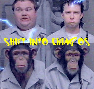 Another day at the Juice Bar, the Rangers teens conversing like normal. Kat is about to take Justin to class (summer school?) while Adam is off to his job at the Stunt Show. Suddenly, a rift in the Zeo Plothole Continuum opens up and spews out Emily, Jason's girlfriend! She tells them she's got something to show them they're not going to believe. The gang follows her outside to the back of the Youth Center, where a crowd has gathered. Two art experts (?!) discuss the masterpiece smeared on the wall of the Juice Bar. One thinks it's of an old man pondering the meaning of life, the other thinks it's a beautiful woman saddened by her suitor's departure to war. The authors of this piece, The Bulk & Skull Chimps, weren't trying to make a primate art statement, they were trying to paint hieroglyphics to show they were humans trapped in monkeys bodies! The two chimps eat their paintbrushes, cover Lt. Stone's face in paint, and get nowhere in trying to get returned to their natural forms. The gang of Ranger teens, and Emily (whom will never be seen again) laugh.